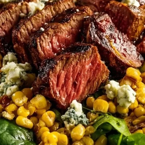 Now that your steak is grilled and the corn is roasted, it’s time to assemble your salad. In a large bowl, combine your mixed greens—arugula, spinach, and romaine make for a vibrant and colorful base. As you toss them together, you can almost feel the freshness of each leaf. Add the roasted sweet corn to the greens, and feel free to stir gently to mix them up. Next, sprinkle the crumbled gorgonzola cheese over the top. The contrast of flavors from the creamy cheese and the crunchy greens is simply delightful and visually appealing too.