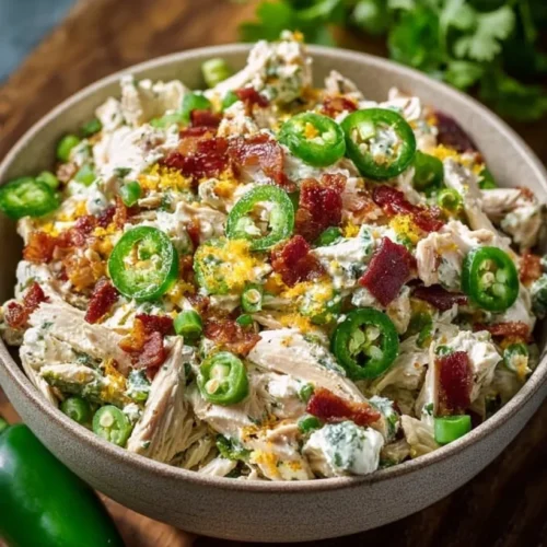 Jalapeño popper chicken salad is a delicious dish that combines shredded chicken, jalapeños, bacon, and cheese, all tossed in a creamy dressing. It captures the flavors of a jalapeño popper appetizer while being a filling meal on its own.